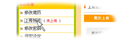 | 注冊(cè)成功后系統(tǒng)會(huì)自動(dòng)跳轉(zhuǎn)到個(gè)人管理頁(yè)面,點(diǎn)擊“上傳照片”,上傳不大于100KB的照片,這樣更容易讓招聘企業(yè)青睞; |